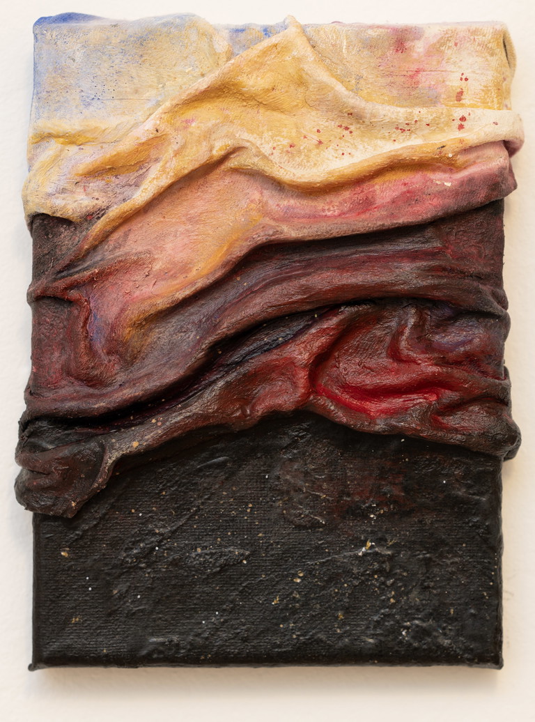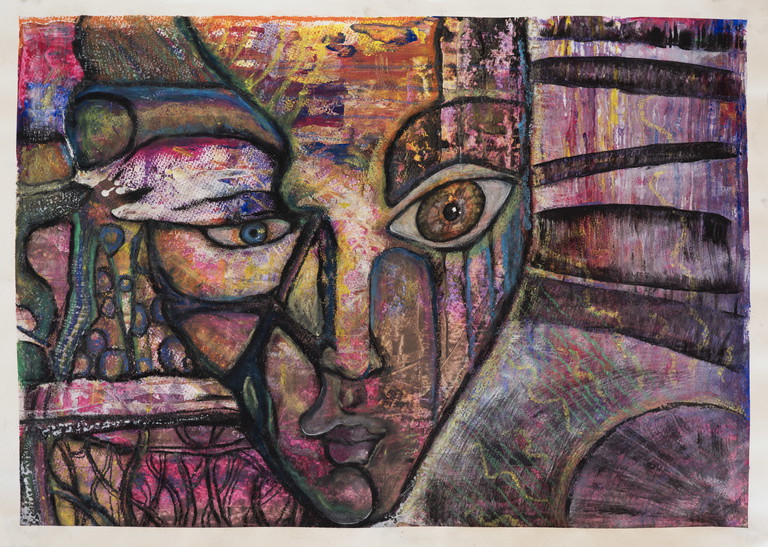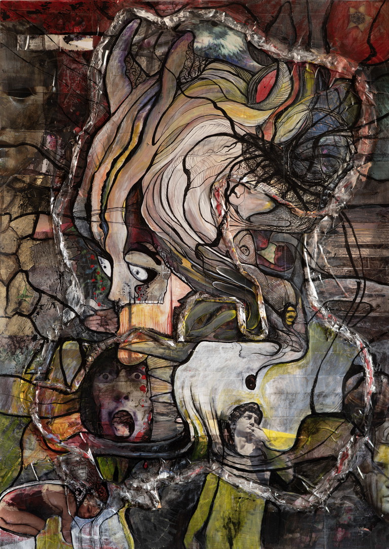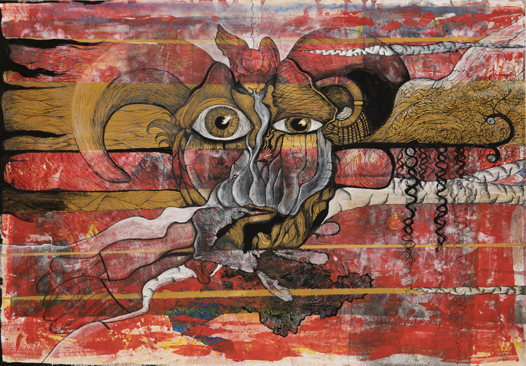 | Beschreibung | Acryl, Tinte, Textil, Gips auf Leinwand. |